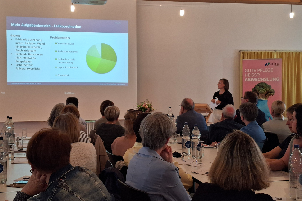 An der diesjährigen Delegiertenversammlung des Spitex Verbands SG|AR|AI stand die künftige Gesundheitsversorgung zu Hause im Zentrum. Fachreferentin Miriam Hagmann zeigte auf, weshalb Koordination zur Schlüsselaufgabe bei der Spitex wird. Im Rahmen von Gesamterneuerungswahlen wurden Brigitte Bühler, Geschäftsführerin Spitex Vorderland, Luzia Krempl, Kantonsrätin St. Gallen (Die Mitte), Habib Kherbeche als Vertretung der kantonalen Ärztegesellschaft St. Gallen sowie Andreas Baumann, Gemeindepräsident von Degersheim SG, in den Vorstand gewählt.
